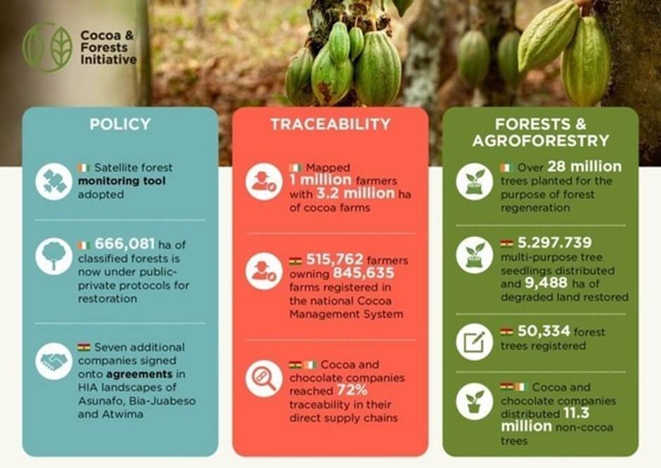The governments of Côte d’Ivoire and Ghana and 35 companies in the Cocoa & Forests Initiative (CFI), including IDH, the Sustainable Trade Initiative and the World Cocoa Foundation (WCF), reported progress made towards ending deforestation in Côte d’Ivoire and Ghana in two joint public/private sector reports.